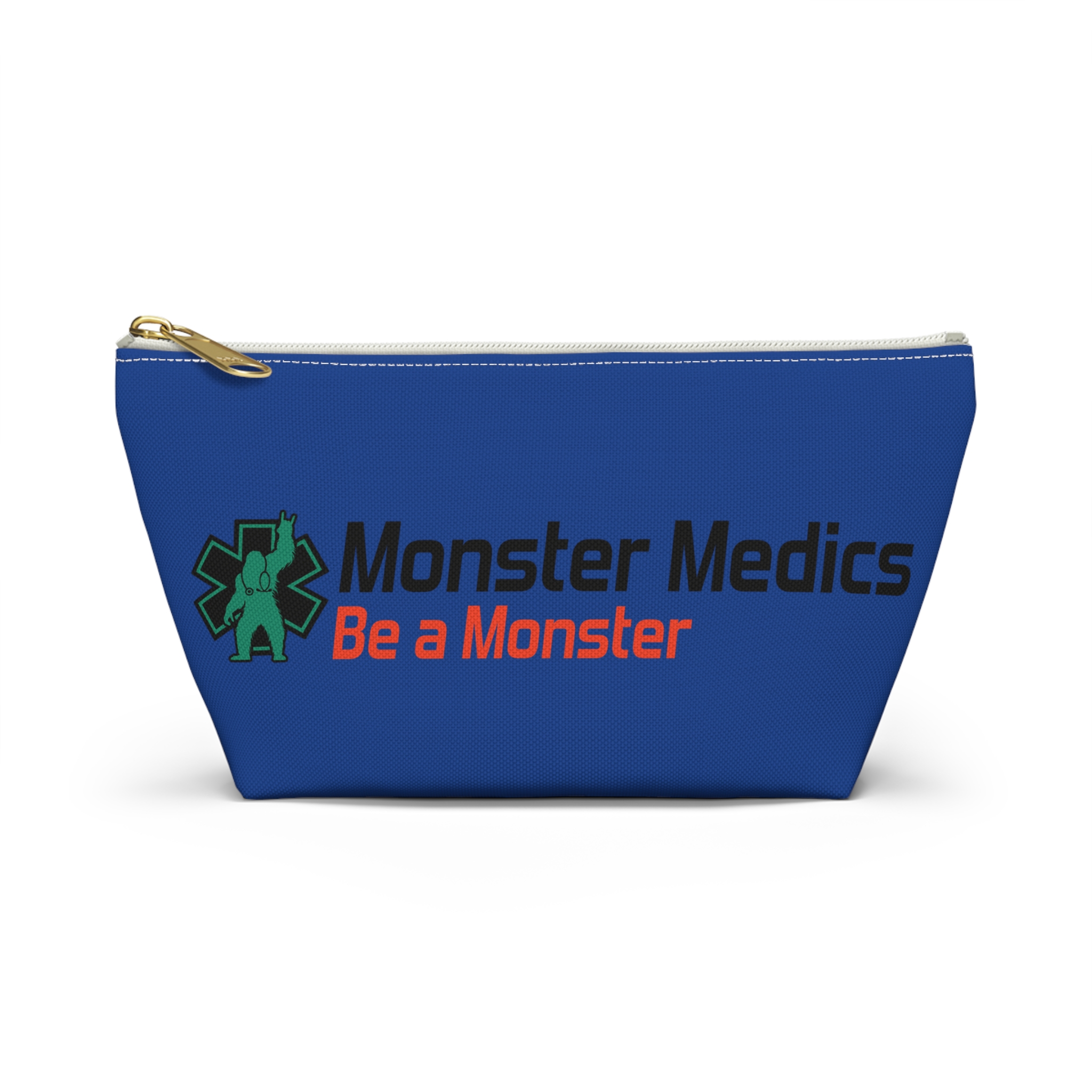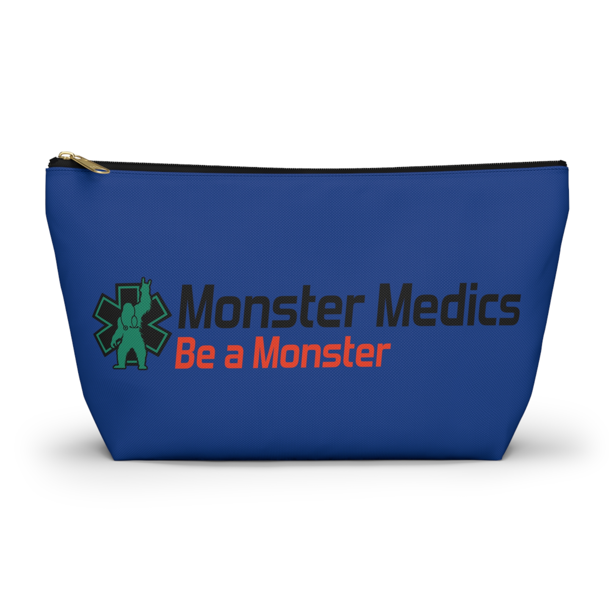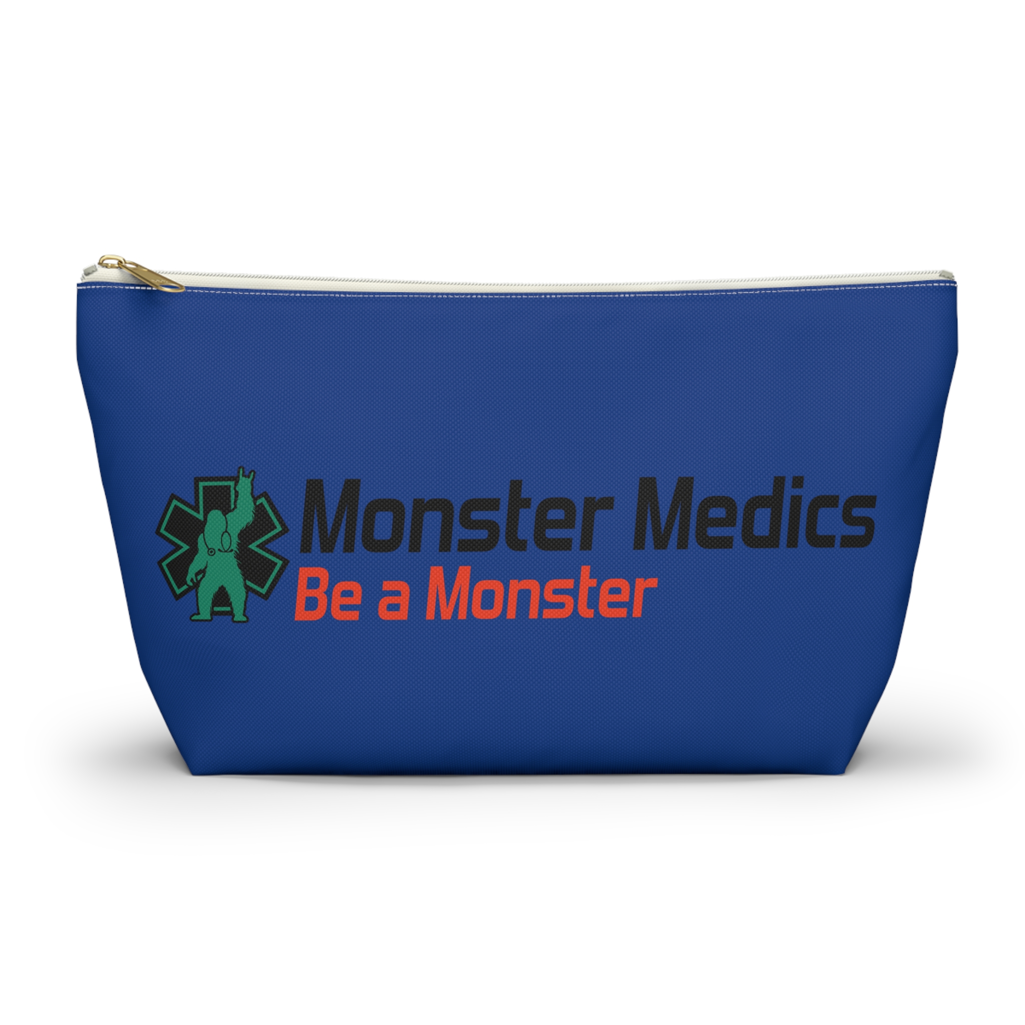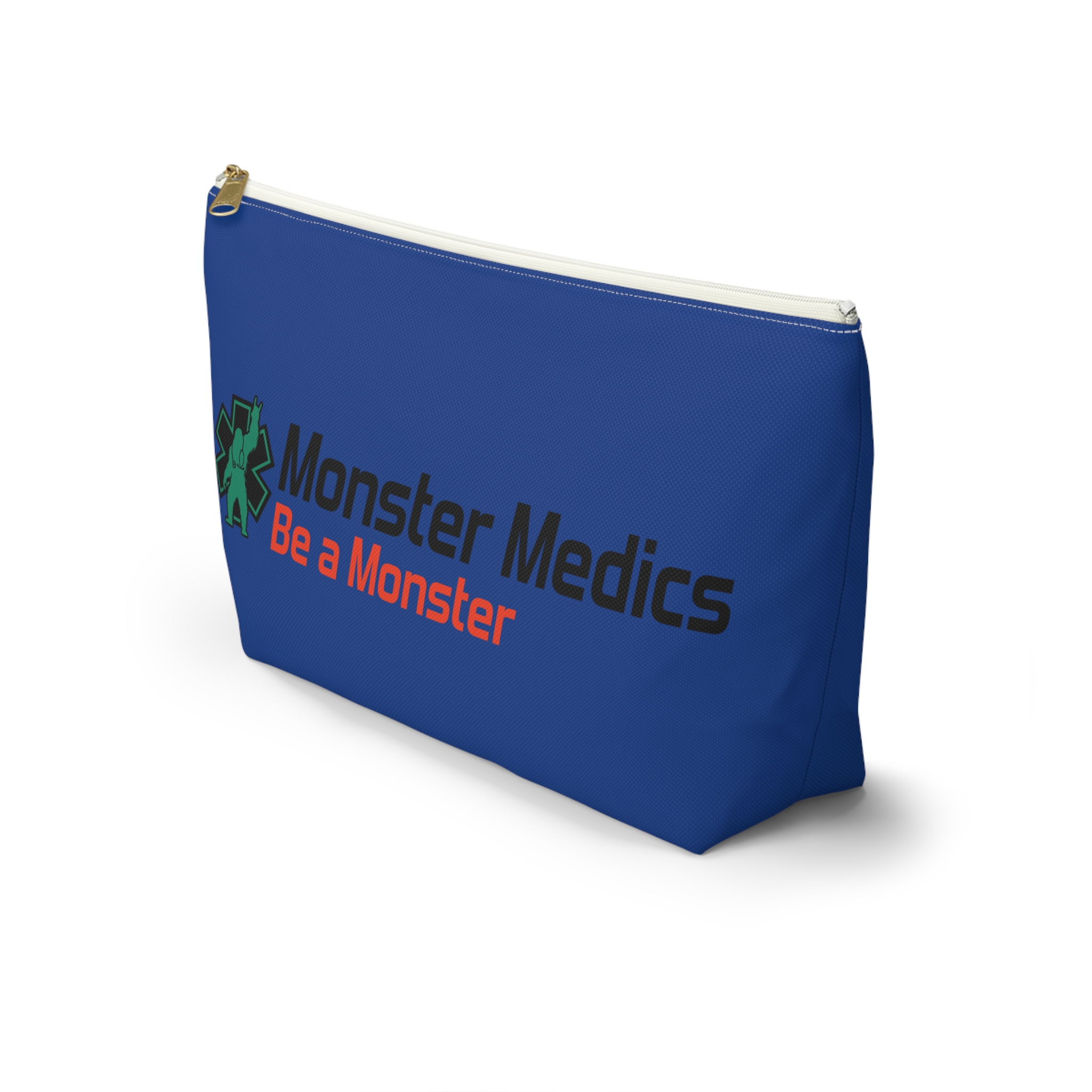 A roomy, structured accessory pouch that carries your everyday essentials with a playful, heroic edge. The bold blue fabric and crisp, high-contrast print celebrate the “Monster Medics” motif — a green, stethoscope-wearing creature framed by an emergency star and the rallying line “Be a Monster.” It’s light, stays shapely thanks to spun polyester, and closes with a matching zipper and gold puller so small items stay secure. Toss it into a work bag or keep it on your counter as a functional, characterful catchall that nods to first responders and night-shift lifesavers who like a little irreverence in their gear.